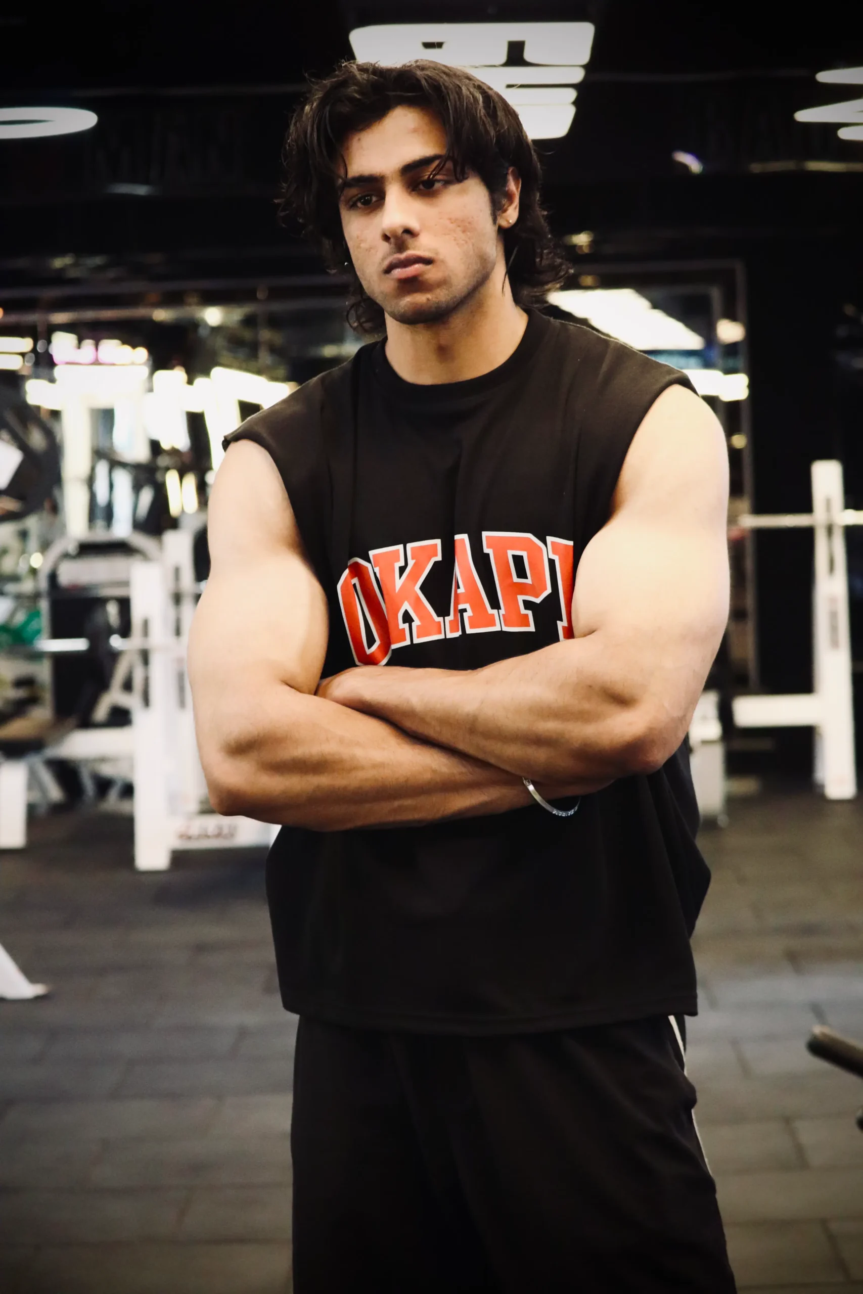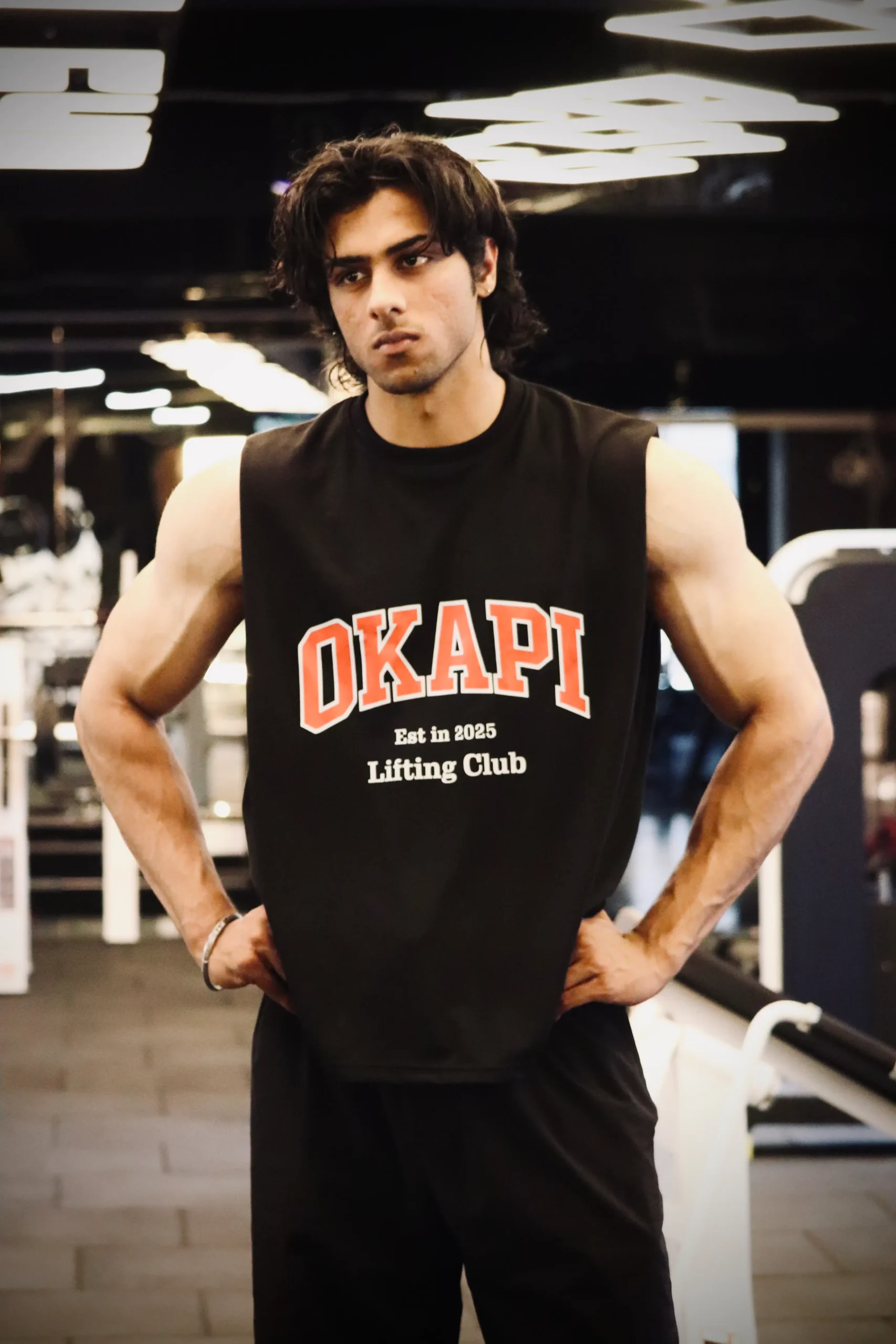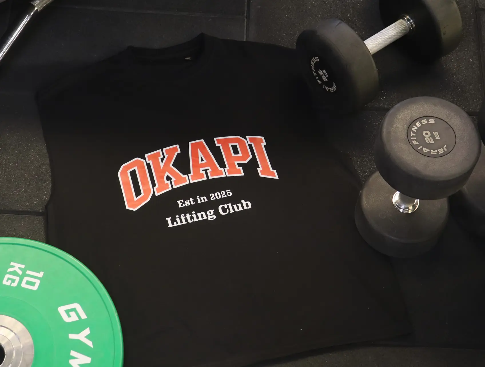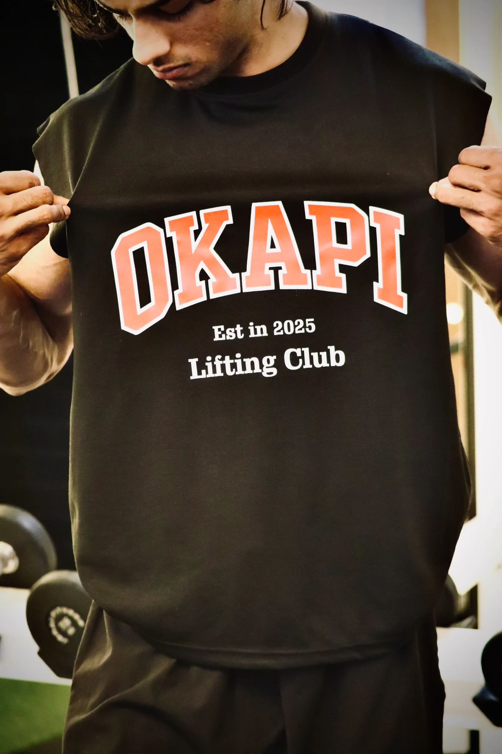 Finished with a bold varsity OKAPI print — a symbol of discipline, consistency, and the lifting culture.