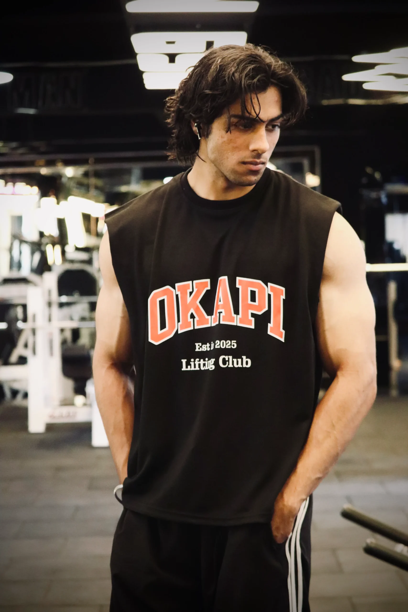 The Okapi Lifting Club Sleeveless Tee is crafted from 100% premium cotton, delivering a structured yet breathable feel that holds its shape through every session. Designed with a relaxed, drop-shoulder silhouette and raw-cut sleeves, it offers unrestricted movement while maintaining a bold, athletic presence.